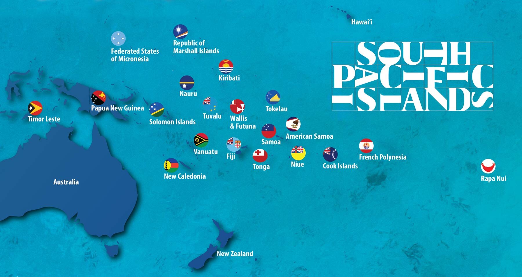 AMERICAN SAMOA • COOK ISLANDS • FEDERATED STATES OF MICRONESIA • FIJI • KIRIBATI • MARSHALL ISLANDS • NAURU • NEW CALEDONIA • NIUE • PAPUA NEW GUINEA • RAPA NUI • SAMOA • SOLOMON ISLANDS • THE ISLANDS • OF TAHITI • TIMOR LESTE • TOKELAU • TONGA • TUVALU • VANUATU • WALLIS AND FUTUNA